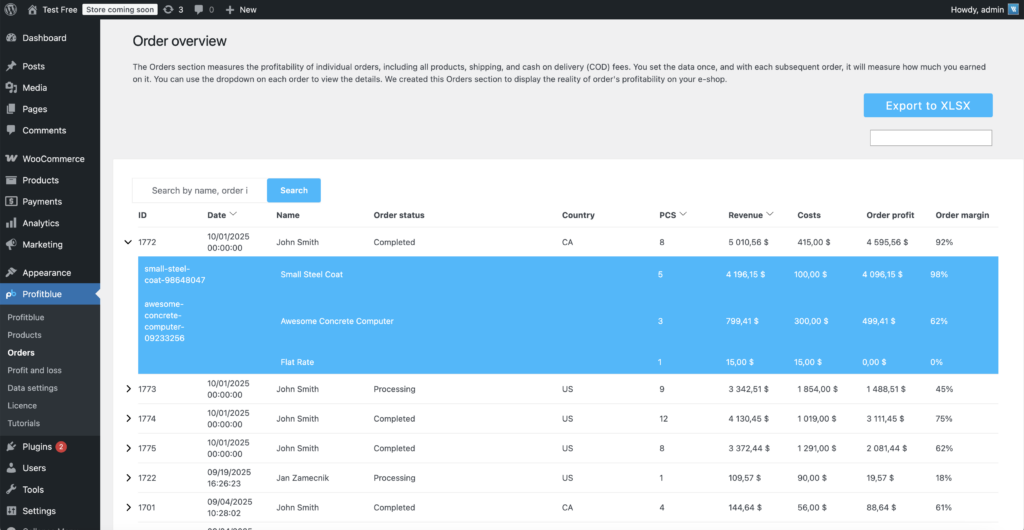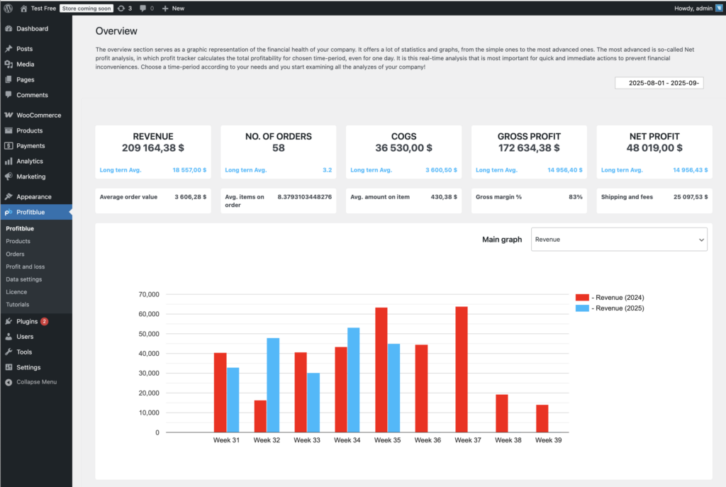 See your WooCommerce finances in simple charts and numbers. Pick a date range and watch results update in real time. The Net Profit view shows what you really earned for any day or period, so you can act fast.