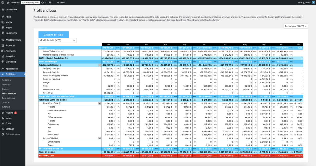 See your store’s profit and loss in a clean month-by-month table. It combines all revenue and costs to show overall profitability. Switch between Month to Date and Year to Date to match how you review results.