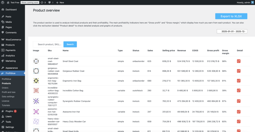 Analyze each product’s profitability in plain view. See Gross profit and Gross margin for every item, and jump into deeper charts with Product detail.